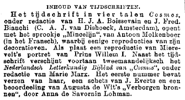 In een advertentie in het Algemeen Handelsblad van 26-01-1901 staat: 'Zooeven verscheen no. 1 v.d. 4en Jaargang van het fraai geïllustreerde veeltalige maandschrift (...) Cosmos.' Bevat poëzie van: