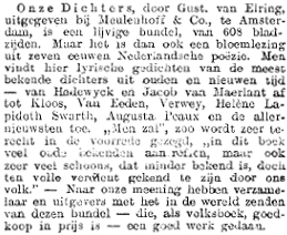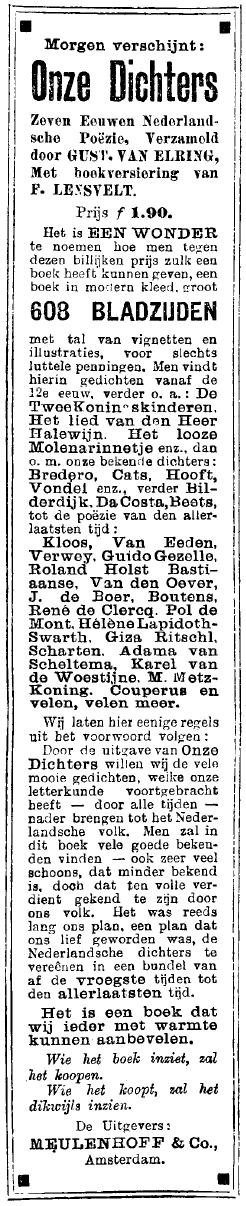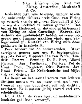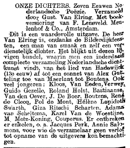 In dit werk staan geen gedichten van Herman Gorter, Jacques Perk en Annie Salomons - dichters die je anno 1908 in een bloemlezing als deze zou verwachten. Kennelijk zijn zij drie van de dichters waarvan de uitgevers, waarover in bovenstaande voorwoord wordt gesproken, weigerden toestemming tot publicatie te geven.