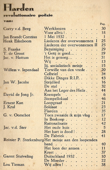 Namen als in boek. Bloemlezing onderzocht door: Bart FM Droog, 2013. Zie ook: In verband hiermede is door de anarchistische schrijvers Martin PAULISSEN, geboren 11.4.1912 te Arnhem, wonende Klarendalscheweg 400 te Arnhem (pseudoniem: Jacques REES) en J. GROOS, wonende Beverstraat 76.B. te Rotterdam - voorheen ook aangesloten bij L.R. - het initiatief genomen tot oprichting van een landelijke Federatie van Arbeiders Schrijvers, welke be-oogt: om op den grondslag van kameraadschappelijke federatieve samen-werking tegenover de demagogische, platburgerlijke kunstproducten op letterkundig gebied, den groei van een nieuwe stijl, de komst van revolutionnaire literatuur te bespoedigen, door middel van periodieke goed-koope uitgaven van verzamelbundels (rev. proza en poëzie), welke aan critiek van het arbeiderspubliek onderworpen zullen worden. Bloemlezing onderzocht door: Bart FM Droog, 2013.