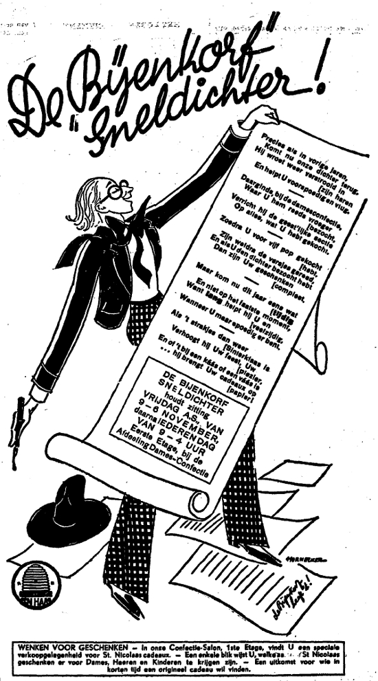 Toegepaste poëzie In Het Vaderland, 23-11-1933. Advertentie van warenhuis De Bijenkorf: de sneldichter. Bron: Historisch Kranten-archief, Koninklijke Bibliotheek Den Haag http://resources2.kb.nl/010015000/pdf/DDD_010015072.pdf