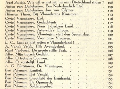 De samensteller heeft ook gepoogd enkele overleden dichters voor zijn ideologisch karretje te spannen, gezien het relatief grote aantal gedichten van René de Clercq (1877-1932), Guido Gezelle (1830-1899), Albrecht Rodenbach (1856-1880) en Karel van den Oever (1879-1926). Uit de verantwoording: "Ook Leo Persyn van Zender Brussel bezorgde ons een paar merkwaardige stukken. Heel in 't bijzonder danken wij Wies Moens en C. Verschaeve voor hun op- en aanmerkingen in verband met de keuze van de gedichten." Bevat poëzie van: