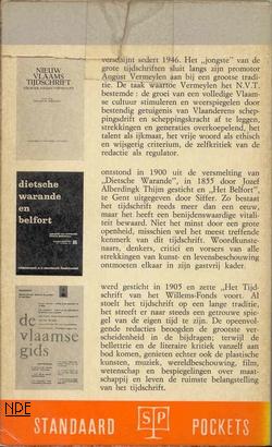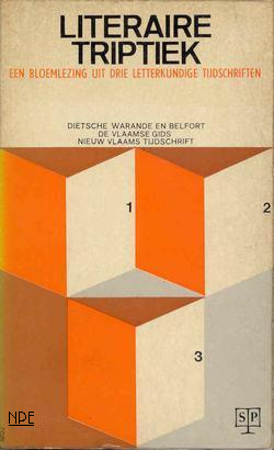 inleiding: De redactie (NVT).] Titel: Literaire triptiek. Een bloemlezing uit drie literaire tijdschriften. [Dietsche Warande en Belfort, De Vlaamse Gids, Nieuw Vlaams Tijdschrift.] Uitgeverij: Uitgeversmaatschappij N.V. Standaard-Boekhandel, Antwerpen/Amsterdam ISBN: - Jaar van verschijning: [1963] Omvang: 208 p. Omslag: Paul Ibou