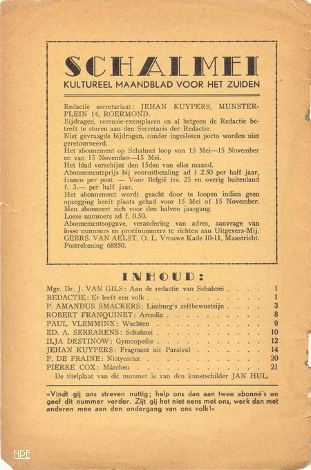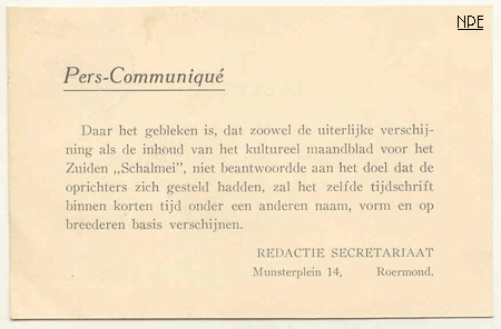 Met betrekking tot het 'Pers-Communiqué': het is de redactie van de NPE niet bekend of het tijdschrift 'binnen korten tijd' onder een andere naam en vorm is verschenen.